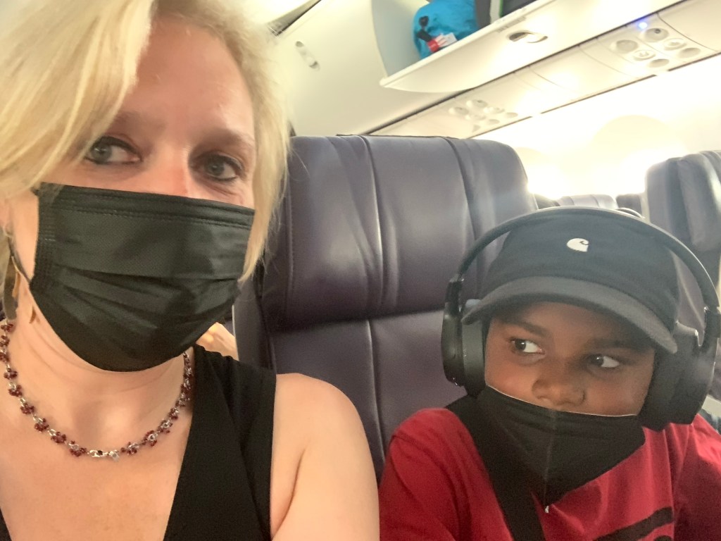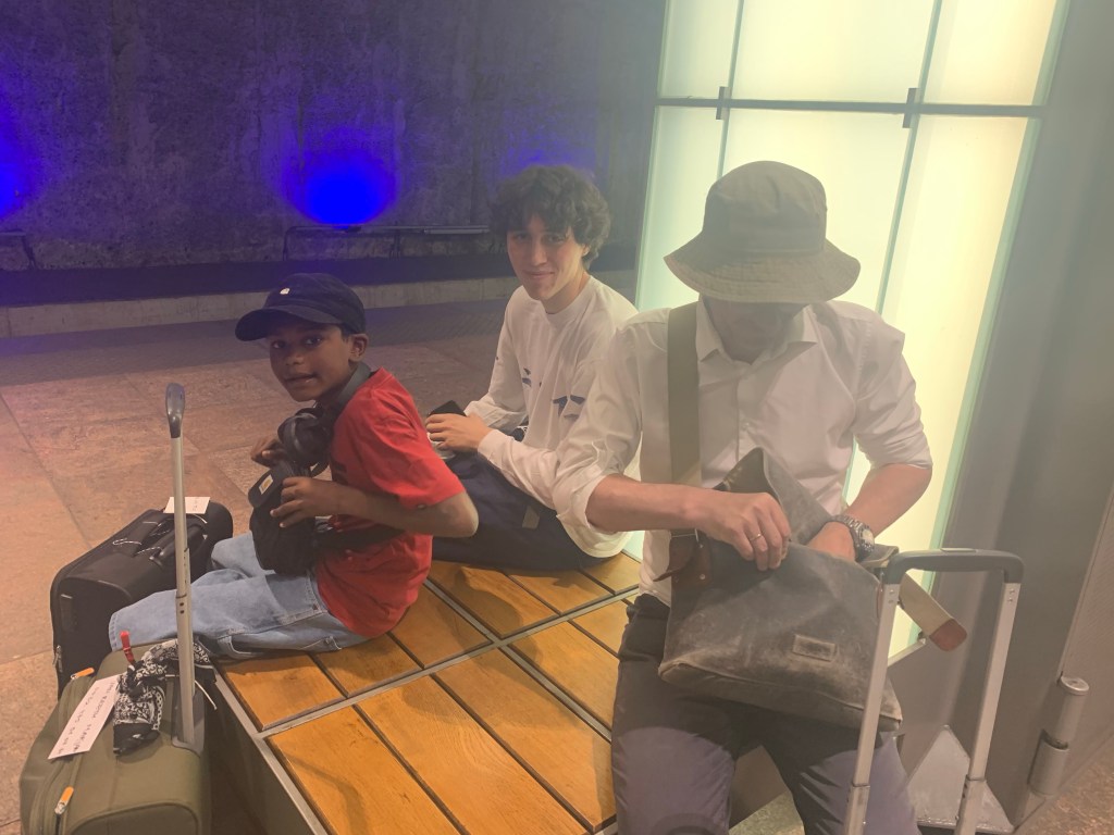 Alles gaat prima… alleen Victor heeft het zitten: alarm gaat af, ceintuur moet uit, veel te grote skatebroek wordt manueel 3 “bijgehouden”. Bovendien moet zijn bagage helemaal worden uitgepakt… ocharme en het is mijn schuld. Ik had hem