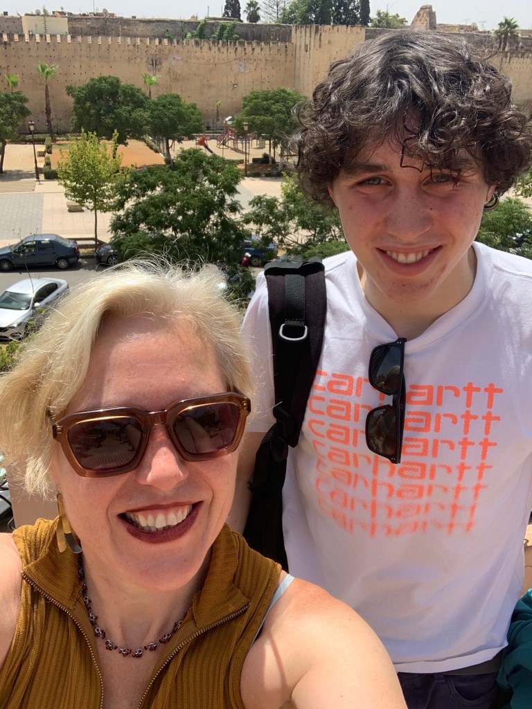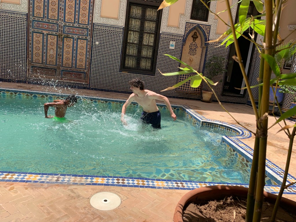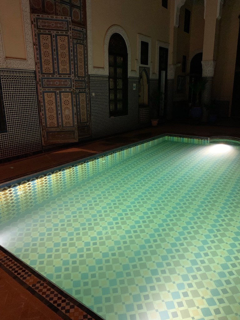 2/8: Marokkaans ontbijt en wandeling in de stad. De gewone gevel verbergt de prachtige Riad Fes Baraka waar we logeren. S Middags rusten we even uit ( ik ben oververhit🥵) aan en in het zwembad